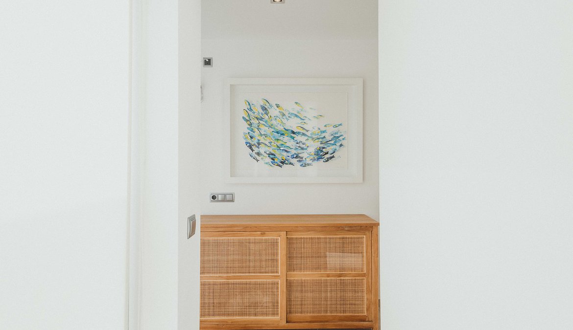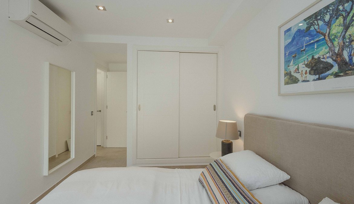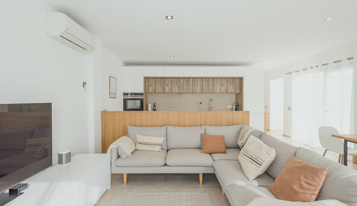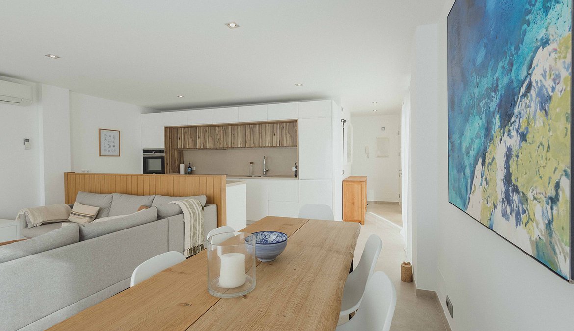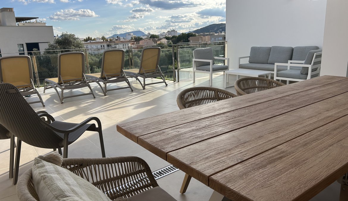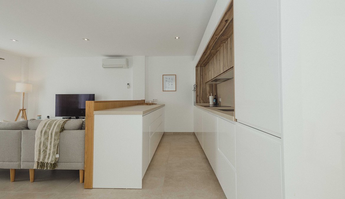A relatively recently built apartment which was starting to look a bit tired so its owners decided to bring it up to date. They had the bathrooms fuly renovated and re-tiled the floor throughout. The kitchen was already open plan but was redesigned to include a lovely long peninsular bar with custom made oak cladding, which provides so much work surface. We love the inclusion of high wall cupboards to maximise storage space and the combination of white and wooden cupboard doors. With 2 loving terraces, one just outside the kitchen for dining and lovley views of the port, the top terrace set up as a chillout zone wiht comfortable sofas and shade area.