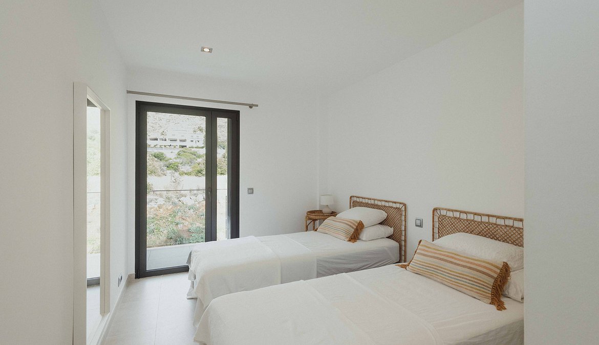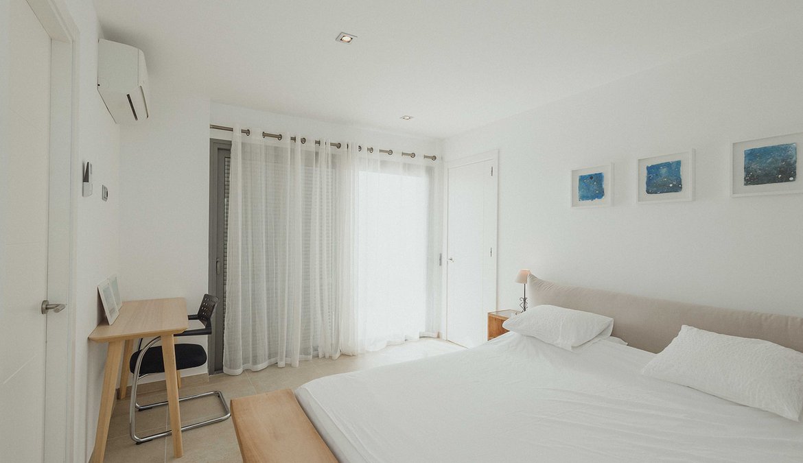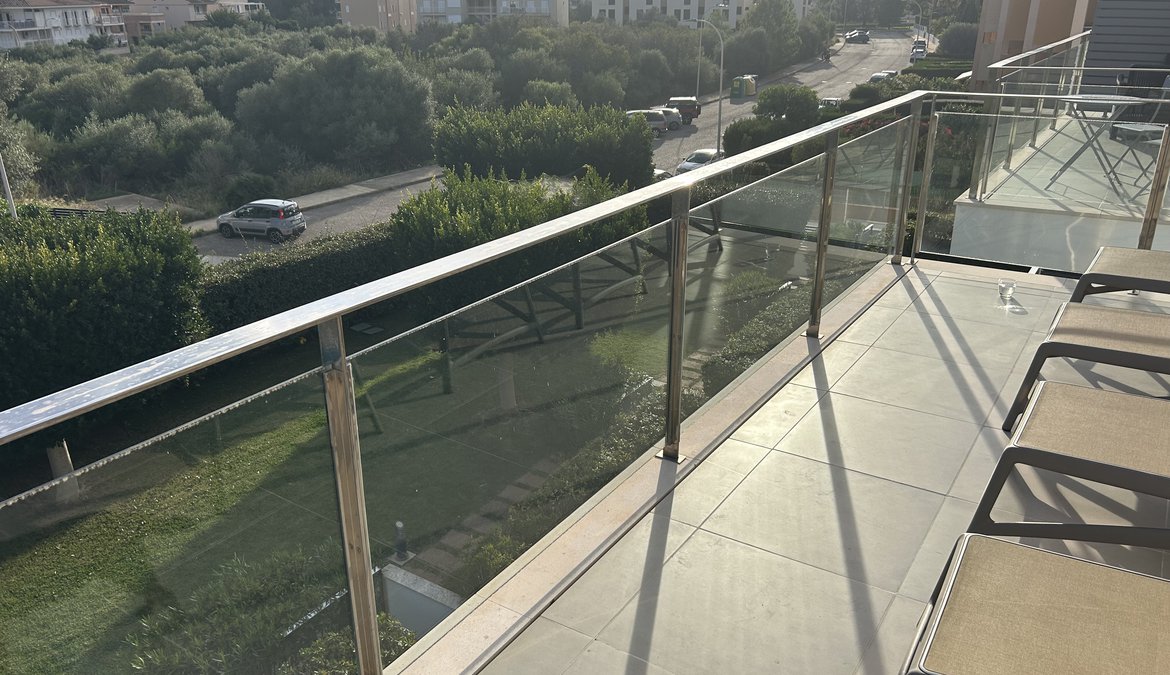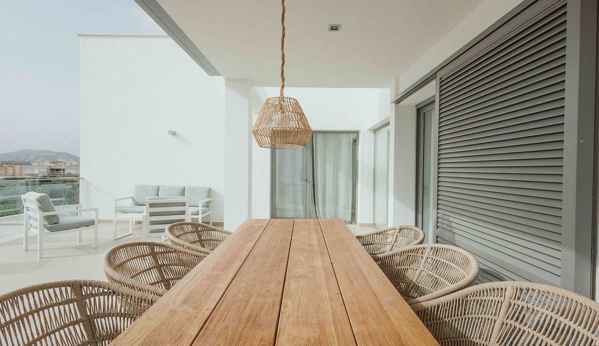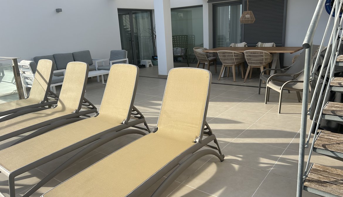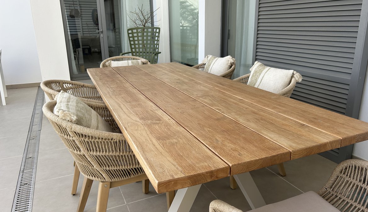 A relatively recently built apartment which was starting to look a bit tired so its owners decided to bring it up to date. They had the bathrooms fuly renovated and re-tiled the floor throughout. The kitchen was already open plan but was redesigned to include a lovely long peninsular bar with custom made oak cladding, which provides so much work surface. We love the inclusion of high wall cupboards to maximise storage space and the combination of white and wooden cupboard doors. With 2 loving terraces, one just outside the kitchen for dining and lovley views of the port, the top terrace set up as a chillout zone wiht comfortable sofas and shade area.